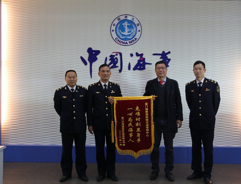 一心为民海事人”的锦旗,感谢厦门海事局成功救助其代理的巴拿马籍搁浅货船“CS FUTURE”轮。1月13日,厦门中润通船务代理有限公司向厦门海事局船舶交通管理中心赠送一面提有“危难时刻显身手。